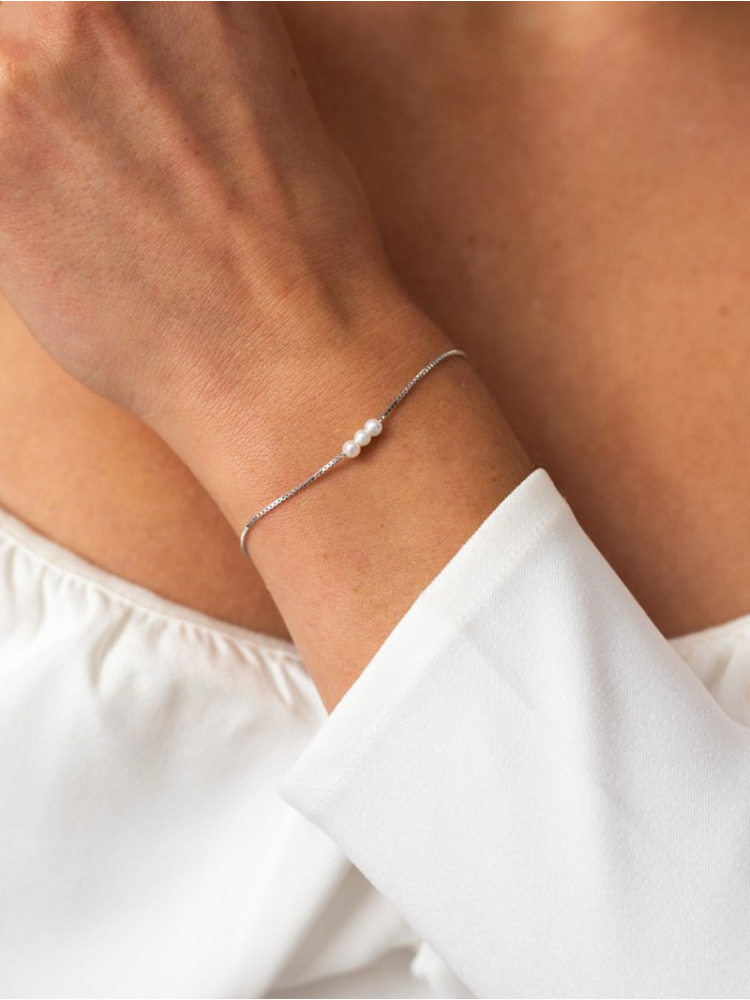 Deze verfijnde schakelarmband heeft drie kleine parels van 3mm in het midden van de armband. deze armband is gesmeed uit sterling zilver en wordt gesloten met een gezekerde veersluiting. een subtiele en klassieke armband, die fijn is om te dragen en gemakkelijk te combineren. verkrijgbaar met een plating van rhodium, 14 kt goud, of rosé goud.