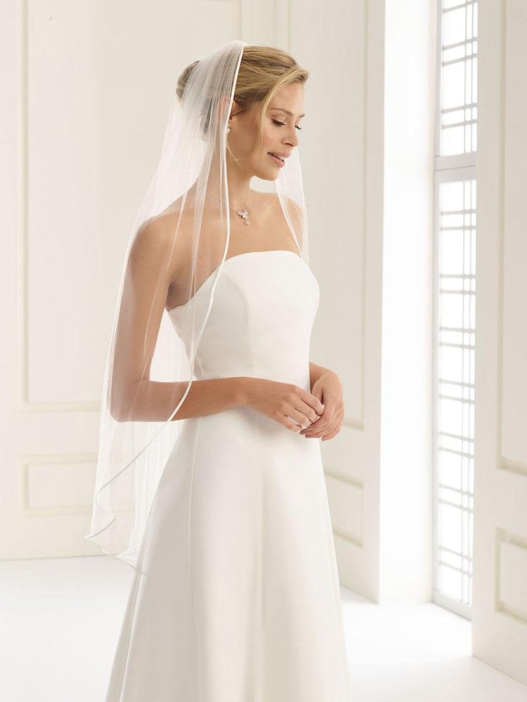 Prachtige Bianco Evento enkellaagse sluier met satijnen bies met een kam om het eenvoudig in het haar te verwerken.