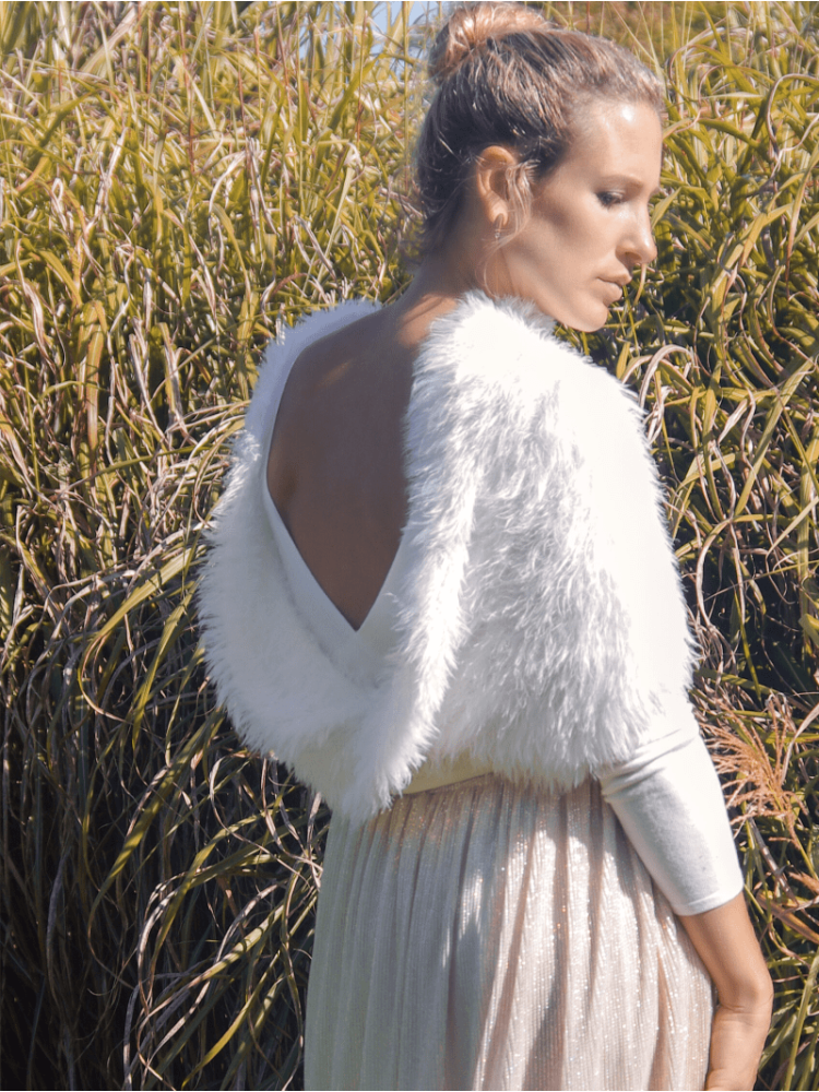 Deze prachtige fluffy sjaal met een soepele lus met rotatie is perfect voor je trouwdag. Hij is erg elastisch en van zachte kwaliteit. De sjaal omarmt je armen en houdt je lekker warm. Deze knitwear bruidskleding is prachtig voor een winter- of herfstbruiloft. De lus met rotatie heeft een omtrek van 110 cm. Je kunt deze mooie sjaal met de omslag aan de voor- en achterkant dragen.