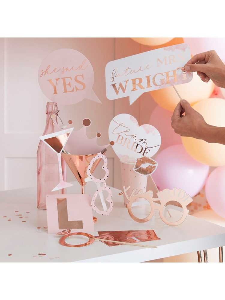 Inhoud: Elk pakket bevat 10 props, waaronder: 1x Future Mrs, 1x Team Bride bril, 1x hartjes bril, 1x lippen, 1x cocktailglas, 1x diamanten ring, 1 x Team Bride, 1x kroontje, 1x She Said Yes en 1x tekstbordje en 2 vellen met roségouden letters om het tekstbordje mee te personaliseren