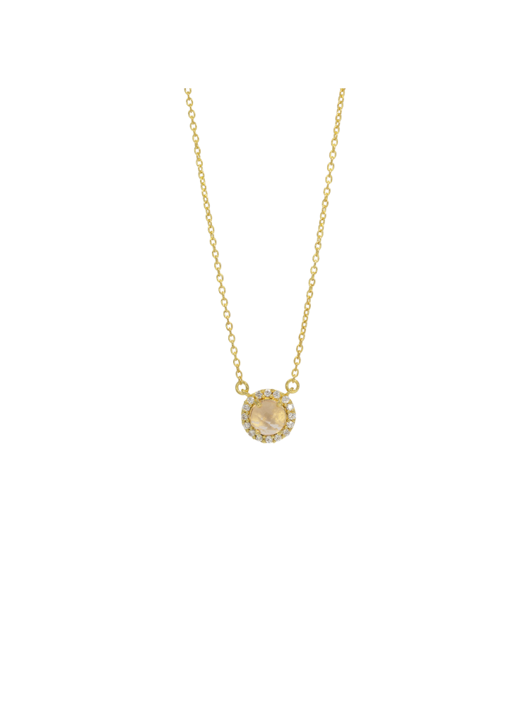 Het hoogtepunt van deze ketting is een ronde hanger van rozenkwarts, prominent omlijst door talloze kleine kristallen.