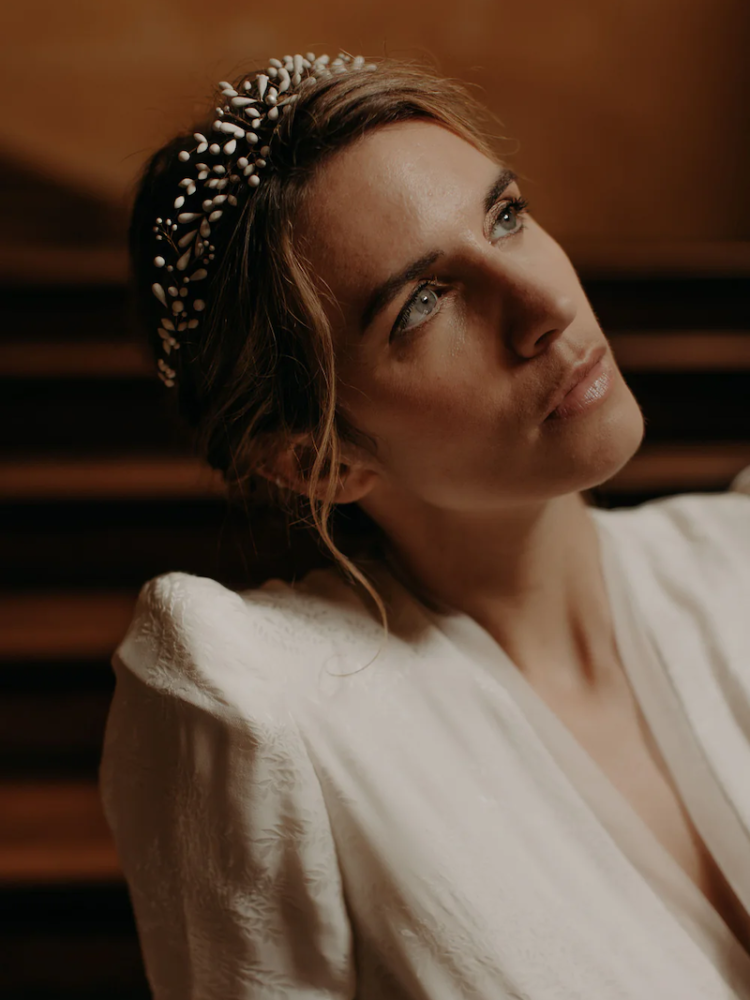 De Felicie tiara is een verfijnd, handgemaakte pièce met porselein en parelmoer kralen, die een zachte sprankeling toevoegt. Lichtgewicht en elegant, perfect voor elke speciale gelegenheid!