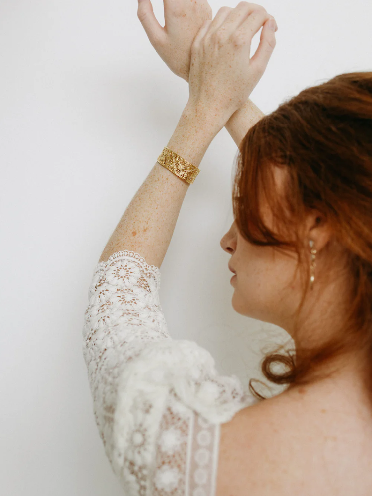 De Ottomaanse armband van Lizeron is een vergulde messing stuk met een ingewikkeld Frans ontworpen patroon. Het is elegant en tijdloos. Het voegt karakter toe aan elke outfit.