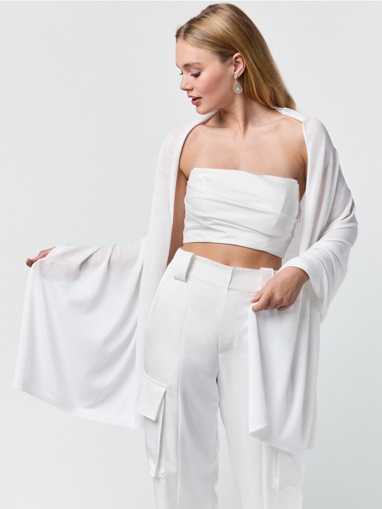 Prachtige ivoorkleurige stola S167 van Poirier. De stola kan op verschillende manieren gedragen worden, bijvoorbeeld over de schouders.