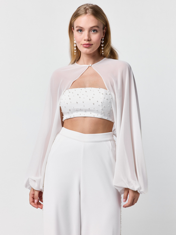 The ST-75322 ivory chiffon cardigan by Poirier features long puffed sleeves, a pleated back, and a soft front closure—ideal for adding elegance and lightness to your wedding look.